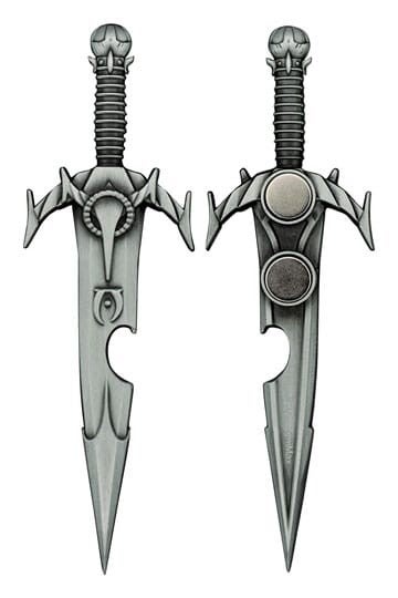 This officially licensed replica in the form of a bottle opener is made from metal with an antique nickel plating, and a cut out in the blade for opening bottles. The back has a magnet for easy storage, and it measures 120 x 40mm.